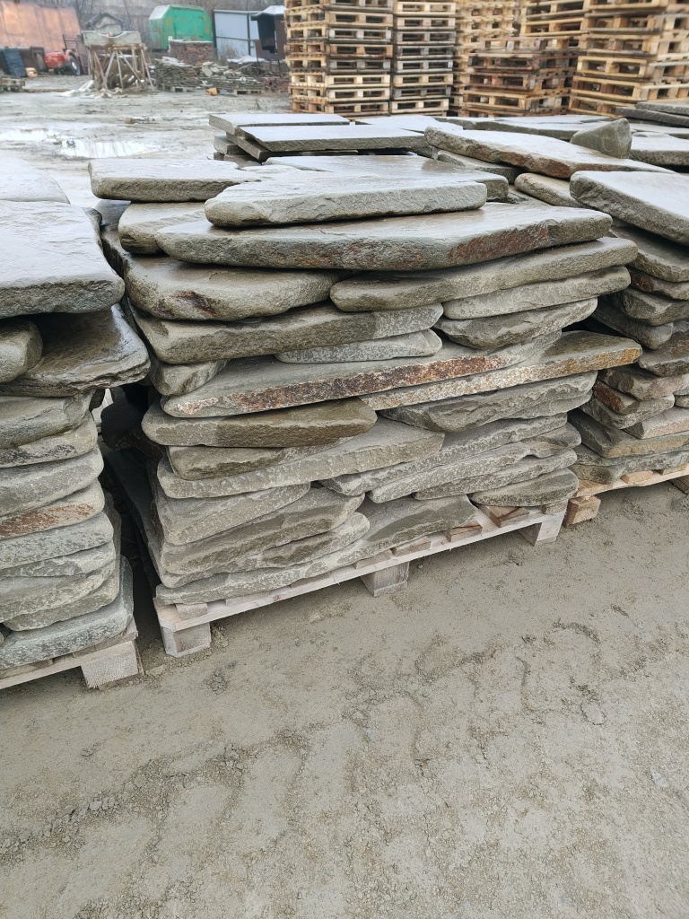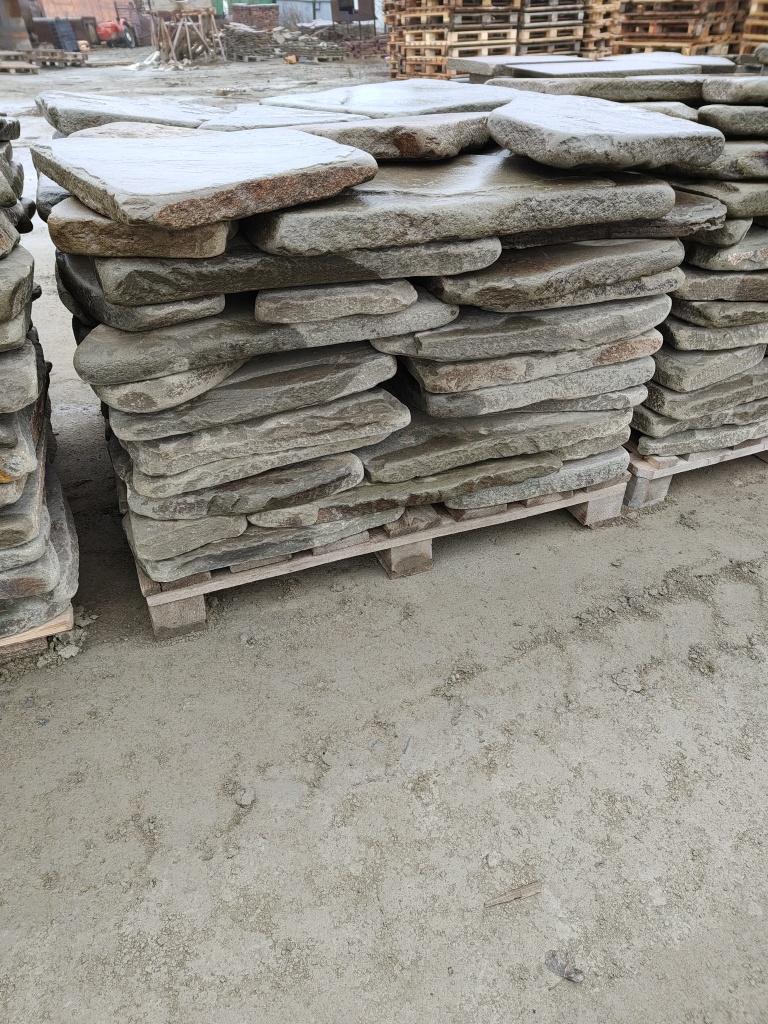 Галтованный серо-зелёный песчаник для мощения дорожек, пешеходных зон, тротуаров на землю, грунт, песчано-щебёночную подушку.